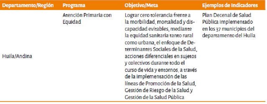 Sobresalen departamentos que, adicionalmente, presentan otras metas relacionadas con estrategias de mejoramiento de los sistemas y análisis de la información desde la mirada de los DSS, como Cundinamarca que tiene como meta implementar la estrategia de la unidad de análisis departamental y provincial de los Determinantes Sociales en Salud y Caldas con la implementación del Observatorio Social a través del subprograma: Sistemas de Información para la gestión colectiva e individual del riesgo.