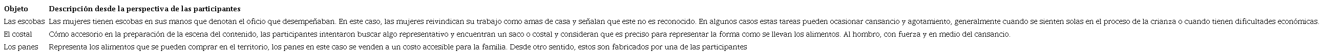 Frente a los objetos en el cuadro No 2, se encuentran elecciones particulares y aparecen en los contenidos objetos como las escobas, los costales (sacos para cargar objetos pesados) o los panes. Detrás de sus elecciones advertimos relaciones con sus actividades que desarrollan en su cotidianidad, que podrían pasar inadvertidos para los equipos audiovisuales cuando construyen los contenidos desde sus realidades y no pasan a un diálogo profundo con las comunidades.