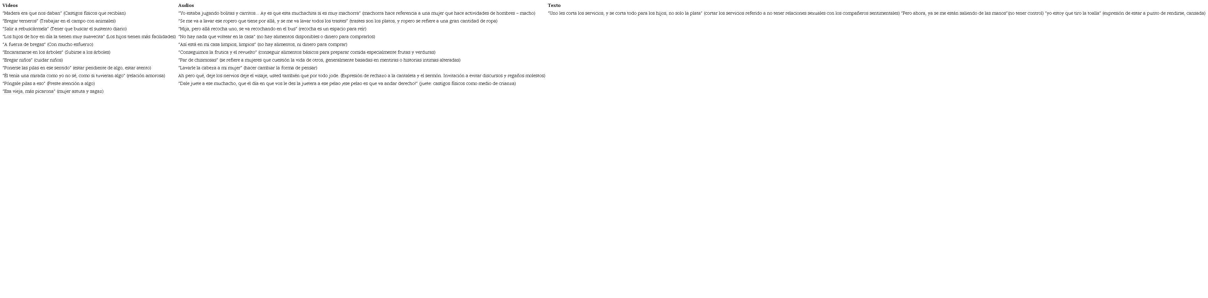 De allí que realizar los contenidos con las participantes, aseguró encontrar palabras y frases propias con las cuáles se identificaban las personas que vivían en el territorio, como se describe en el cuadro 3, en donde se presentan las frases agrupadas de acuerdo con los modos utilizados, en él se observa que las palabras comunes se usan de manera similar en los videos y los audios, y en menor medida en los textos escritos: