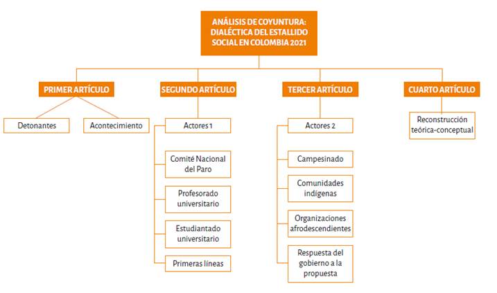 Para efectos de dimensionar la propedéutica empleada por el autor en el análisis que ha venido haciendo respecto al estallido social 2021, es necesario precisar el contenido global del escrito y las partes que lo componen. El primer trabajo abordó los detonantes del estallido social dividido en dos aspectos: acontecimiento y tiempos (larga, mediana y corta duración). Se había planteado, en esa primera entrega, que se escribirían dos artículos más: uno que describiera el papel y la trayectoria de los actores más destacados que habían participado del estallido, y otro que reconstruyera con criterios teóricoconceptuales toda la reflexión.