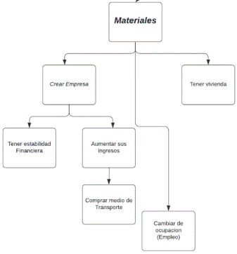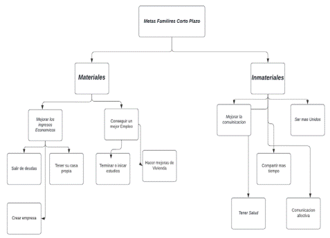 En la imagen se puede apreciar las diferentes categorías y subcategorías; la categoría de metas a corto plazo es la primera de las cuales emergen las subcategorías materiales e inmateriales; en la primera materiales emergen dos sub categorías emergentes que son: mejorar los ingresos económicos y conseguir un mejor empleo, en la segunda categoría inmateriales emergen dos subcategorías que son: Mejorar la comunicación y ser más unidos.