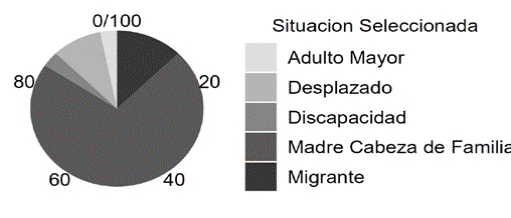 De acuerdo con la situación percibida por los participantes (Figura 3) el (71.8%) de los participantes son madres cabezas de familia, el (12.5%) son inmigrantes residentes en la ciudad de Bucaramanga, el (9.3%) personas que tienen condición víctima de la violencia para esta investigación y de acuerdo a la población (Desplazados), Adultos Mayor el (3.12%) y el (3.1%) personas en condición de discapacidad física.
