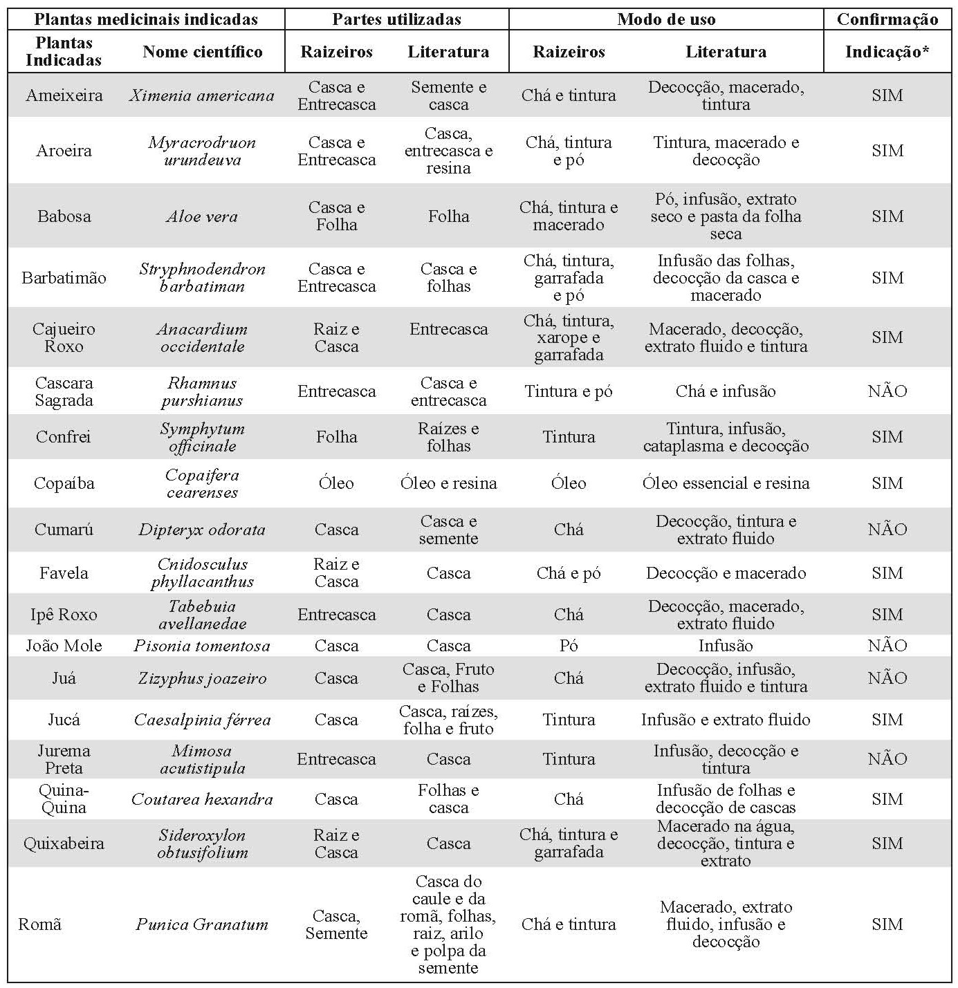 Com relação às plantas medicinas, os achados mais importantes no presente estudo foram referentes à Cáscara Sagrada, Cumaru, João Mole, Juazeiro e Jurema Preta. Parte dos raizeiros entrevistados indicaram essas plantas para o tratamento de feridas, contudo, nas bases de dados e literaturas consultadas a utilização delas se dá sobre outros aspectos.