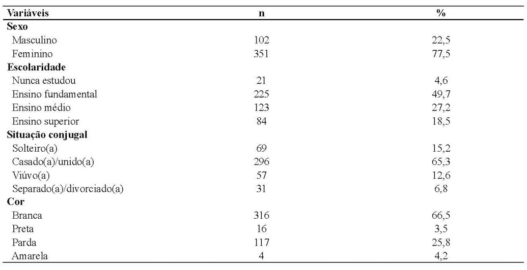 Participaram do estudo 453 adultos, sendo 77,5% (n=351) do sexo feminino. A média de idade foi de 52,0 ± 16,23 anos. A distribuição percentual da população adulta segundo características sociodemográficas se encontra na Tabela I. Ainda, 49,7% (n=225) apresentaram baixa escolaridade.