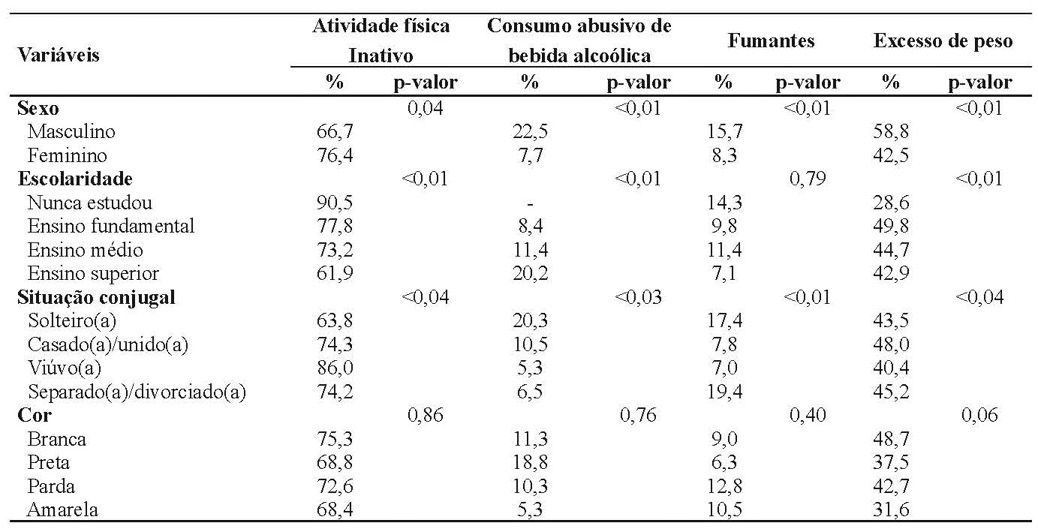 Quanto ao consumo abusivo de álcool, os indivíduos do sexo masculino, com baixa escolaridade e entre os solteiros (as) tiveram significância estatística. O cigarro foi prevalente entre os homens e os solteiros (as) e o excesso de peso entre os indivíduos do sexo masculino, baixa escolaridade e casados(as), com significância estatística para essas variáveis.