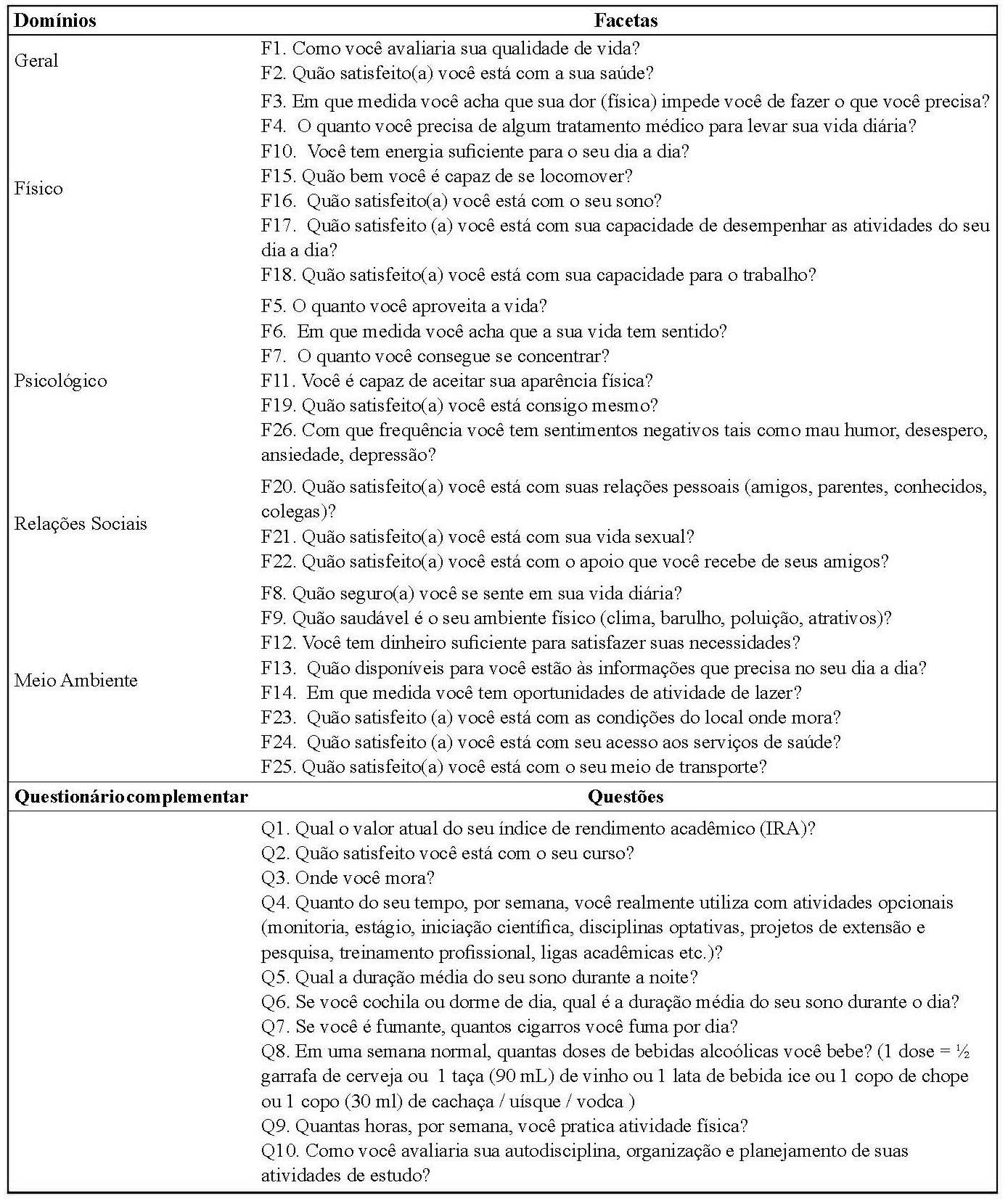 Utilizou-se como instrumento de coleta de dados o questionário World Health Organization Quality of Life - bref (WHOQOL-bref), versão portuguesa, estruturado em domínios (Quadro I), sendo composto por 26 questões de múltipla escolha em escala Likert, sendo validada sua versão em português (Brasil)(13). Segundo a metodologia preconizada para a versão deste instrumento, as características psicométricas preencheram os critérios de desempenho exigidos: consistência interna, validade discriminante, validade convergente, validade de critério e fidedignidade de teste-reteste(13). Além disso, aplicou-se um questionário complementar estruturado especialmente para o presente estudo, baseado na literatura, composto de nove questões de múltipla escolha e uma questão aberta referente ao valor do índice do rendimento acadêmico (IRA). Pesquisador treinado, de forma padronizada, convidou cada participante o qual recebeu conhecimentos detalhados sobre o estudo, consentindo voluntariamente sua participação com a assinatura do TCLE.