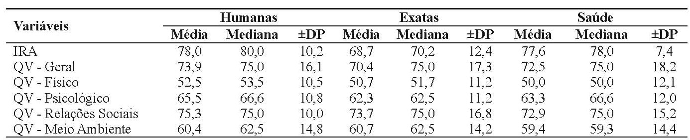 A tabela I apresenta a média, a mediana e o desvio padrão do IRA e nas linhas seguintes estão as respectivas medidas estatísticas de tendência central e de dispersão de cada um dos domínios do questionário abreviado de qualidade de vida da OMS (WHOQOL-bref) das três grandes áreas do conhecimento: humanas, exatas e saúde.