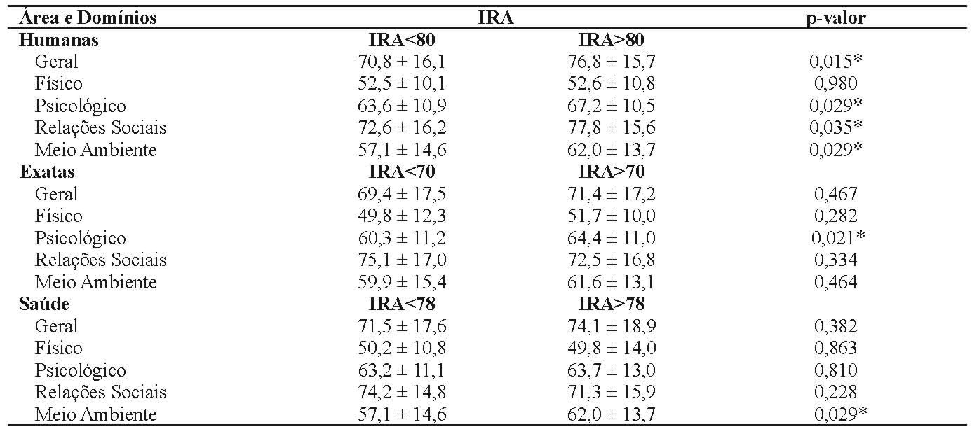Observou-se pelos resultados do presente estudo que a área das humanas possui os maiores valores da média e da mediana para o IRA, seguida pelos valores da área da saúde. Nas humanas, os domínios geral, psicológico, relações sociais e meio ambiente têm relações significativas com o IRA, sendo o domínio físico o único sem diferença significativa.