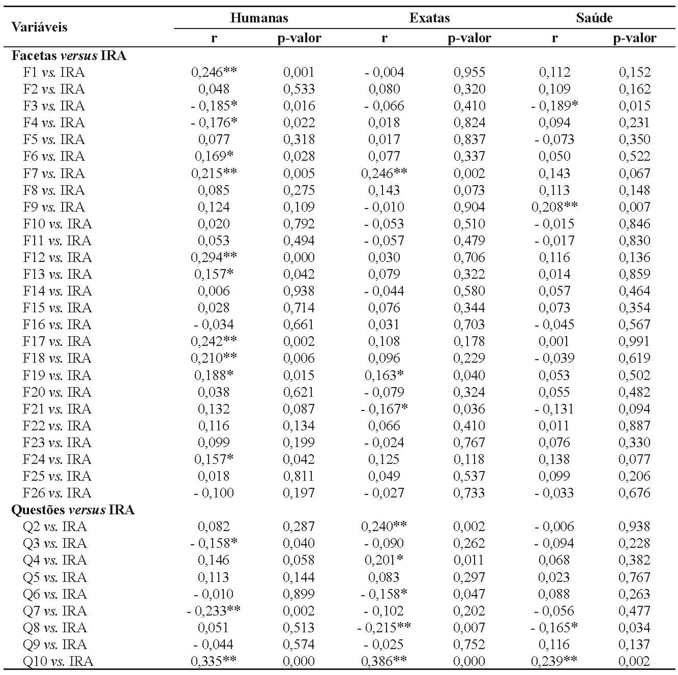 Os resultados da associação entre IRA e as questões do questionário WHOQOL-bref e do questionário complementar foram analisados por área do conhecimento (humanas, exatas e saúde). Na tabela III, são apresentados os resultados da correlação de Spearman através do seu coeficiente de correlação (r) e o nível de significância (p) dessa correlação entre o índice de rendimento acadêmico (IRA) e as facetas e questões do questionário WHOQOL-bref e do questionário complementar, respectivamente.