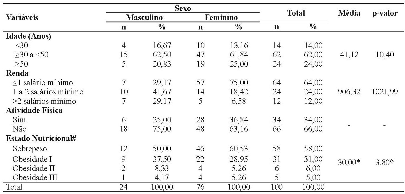 Quanto à renda mensal, a média foi de R$906,32 ± R$1021,99, e a maior parte das pessoas (64,00%, n=64) relatou receber menos de 1 salário mínimo. Com relação ao estado nutricional, a maioria dos entrevistados (58,00%, n=58) apresentou o diagnóstico de sobrepeso, com média do IMC de 30,00 ± 3,80 Kg/m2. Esse dado se confirmou quando se separou por sexo, em que 60,53% (n=46) das mulheres e 50,00% (n=12) dos homens apresentaram esse estado nutricional.