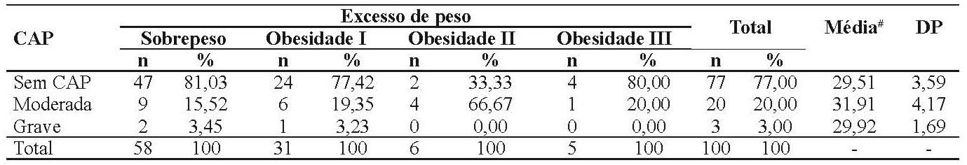 De acordo com a tabela II, percebeu-se que as médias de IMC foram maiores nos entrevistados com CAP moderada e grave, com 31,91 ± 4,17 e 29,92 ± 1,69 respectivamente, quando comparado aos sem CAP (p=0,03).