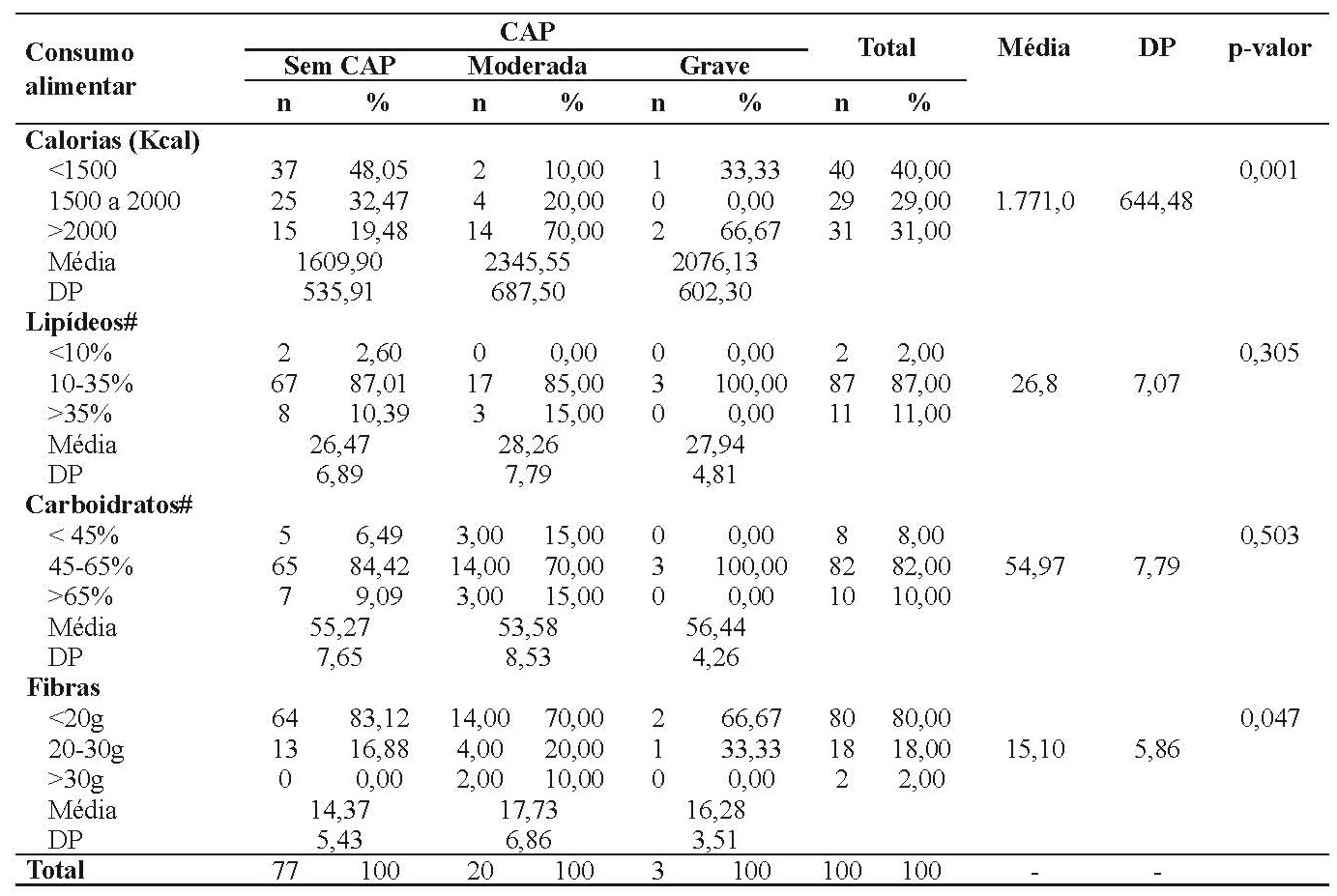 Em um trabalho realizado com pacientes atendidos no Laboratório de Avaliação Nutricional (LAN) da Universidade Paulista, Campus Araçatuba-SP, de 20 a 65 anos de idade(29), foi possível perceber que o consumo de carboidrato assemelha-se com o percebido no trabalho atual, uma vez que encontra-se dentro dos níveis preconizados. Por outro lado, indivíduos com CAP moderada e grave demostraram consumir uma quantidade menor de lipídios em gramas, quando relacionados com aqueles sem CAP. O contrário sendo visto quando relacionado a esse lipídio com o total de calorias consumidas, embora não confirmado aqui estatisticamente. A ausência de significância pode resultar do número bem menor de indivíduos diagnosticados com CAP, comparado aos sem CAP. Entretanto, considerando o perfil encontrado de consumo de lipídios, em gramas, em detrimento da análise estatística, o menor consumo de lipídio entre aqueles com CAP pode ter decorrido da omissão do consumo real pelos indivíduos diagnosticados com CAP, podendo assim ter subestimado o real consumo.
