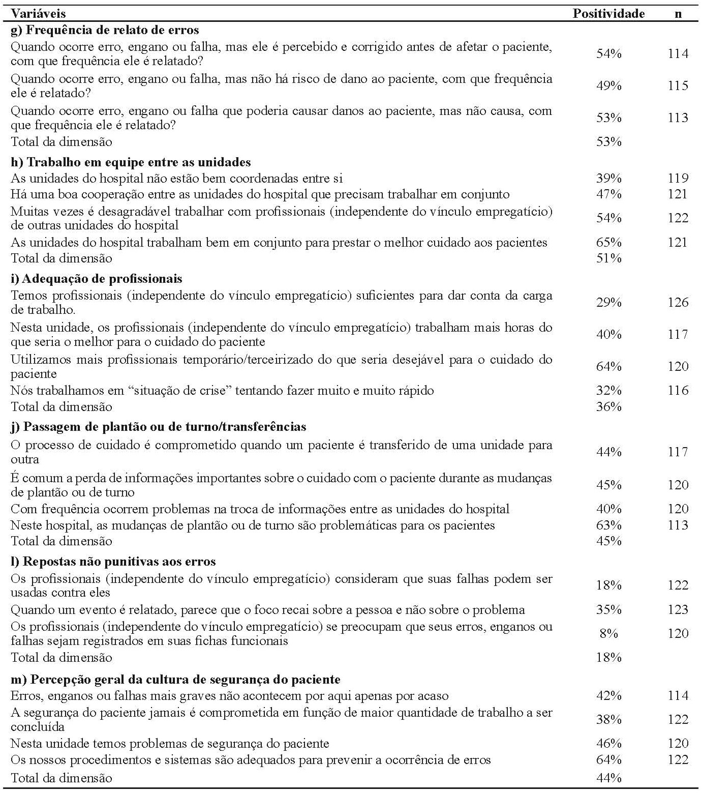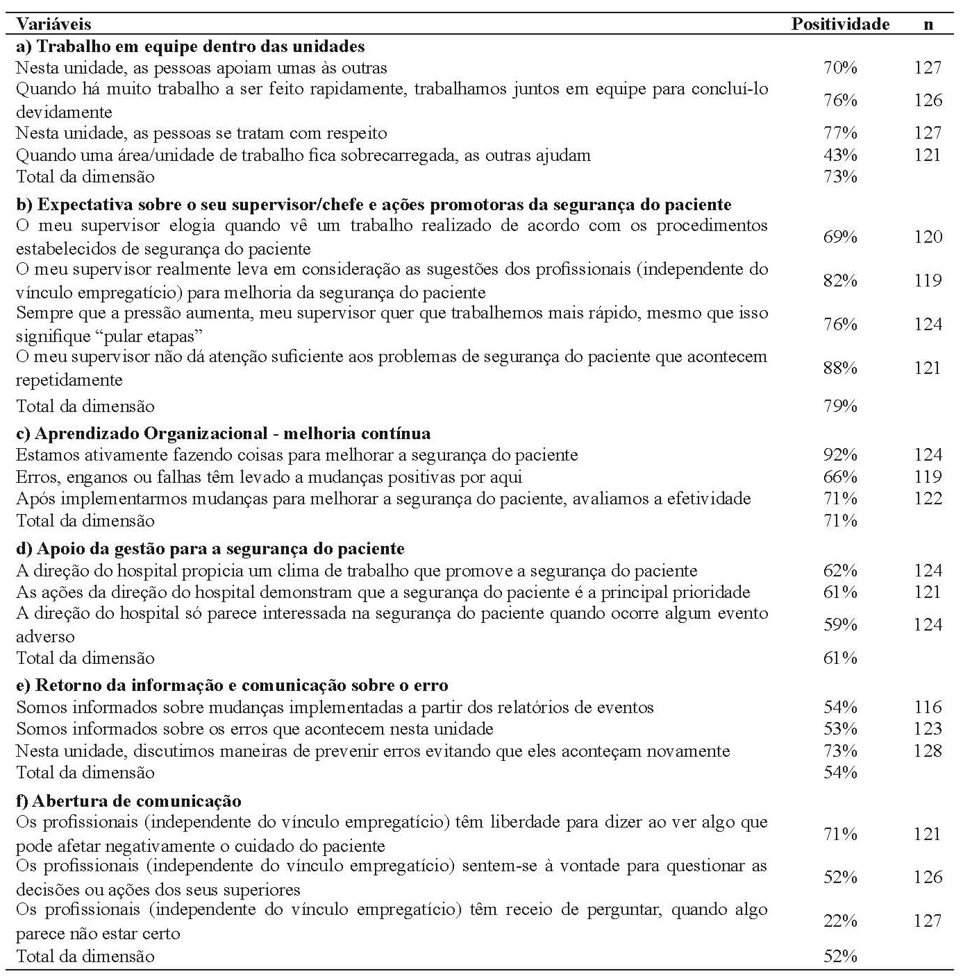 Calculou-se o percentual de respostas positivas, tanto para as dimensões da cultura de segurança do paciente como para cada item componente da dimensão, definidos como o percentual médio de respostas positivas, utilizando-se a seguinte fórmula: % de respostas positivas da dimensão X=(A/B)x100 {Legenda: A= número de respostas positivas aos itens da dimensão ou à dimensão X; B=número total de respostas válidas aos itens da dimensão X ou à dimensão X (positivas, neutras e negativas, excluindo-se os dados ausentes)}. Foram investigadas as 12 dimensões da cultura de segurança do paciente do HSOPSC, que são: trabalho em equipe dentro das unidades, expectativa sobre o seu supervisor/chefe e ações promotoras da segurança do paciente, aprendizado organizacional - melhoria contínua, apoio da gestão para a segurança do paciente, retorno da informação e comunicação sobre o erro, abertura de comunicação, frequência de relato de erros, trabalho em equipe entre as unidades, adequação de profissionais, passagem de plantão ou de turno/transferências, repostas não punitivas aos erros, além da percepção geral da cultura de segurança do paciente.