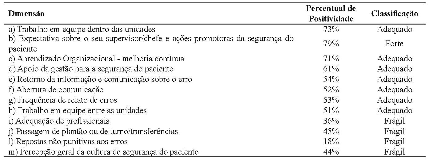 Assim, pode-se observar que a Instituição possui 4 dimensões como pontos frágeis da cultura de segurança do paciente, 1 como ponto forte e 7 dimensões consideradas adequadas (Tabela II).