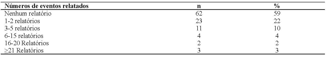 Em relação ao número de eventos relatados pelos funcionários no último ano, pode-se perceber que a maioria (59%, n=62) não relatou nenhum evento (Tabela III).