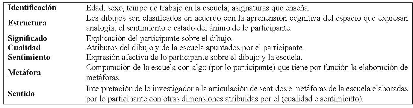 A las maestras les fue solicitado que hiciesen un dibujo que representase su escuela y que iba acompañado de comentarios sobre su significado, sobre los afectos que surgieron a partir de él, la comparación de la escuela con algún objeto, y los espacios de la escuela más utilizados por las participantes. El análisis del dibujo de cada una de las maestras en conjunto con sus contestaciones constituye su mapa afectivo. Así, los mapas se presentan como una construcción que los investigadores elaboran a partir de los datos (dibujo - presentados en el cuadro II - y su significado) aportados por las maestras. Para hacer este análisis se siguió las etapas contenidas en en el cuadro I(17).