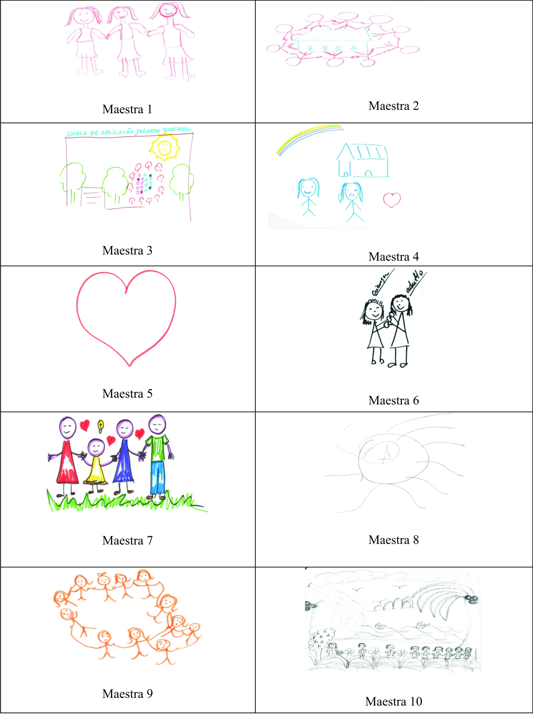 Por consiguiente, con estas ideas y a modo de ejemplo, constatamos que algunas maestras, al responder a los estímulos del dibujo definen la escuela como una familia, un sol en sus vidas, un lugar de amistad y apoyo, en el que se realiza el trabajo en paz, unión y amor como se percibe en los dibujos y discursos de las maestras 5, 7 y 3 (Cuadro II).