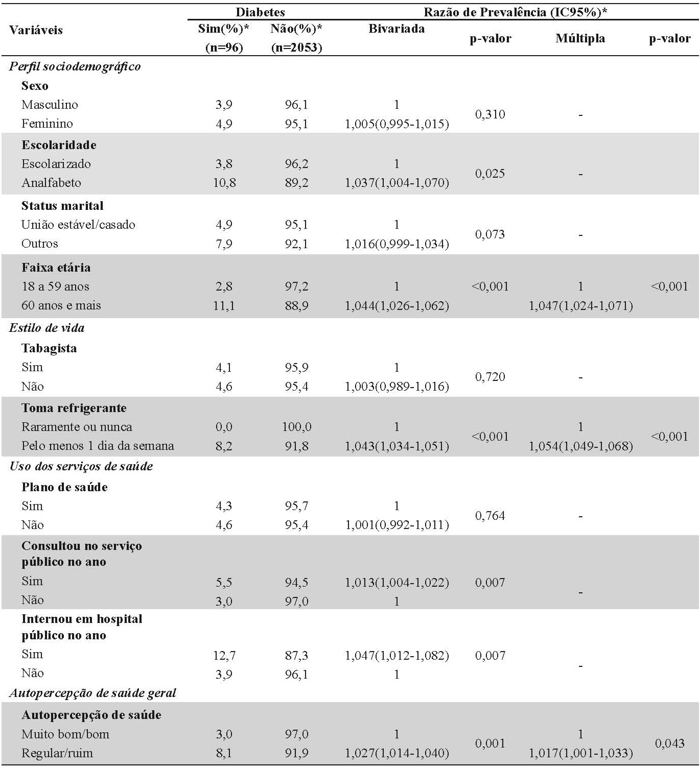 Avaliou-se a associação da prevalência da diabetes mellitus autorreferida com as variáveis independentes agrupadas da seguinte forma: perfil sociodemográfico (sexo, escolaridade, status marital e faixa etária), estilo de vida (tabagista e uso de refrigerante), uso dos serviços de saúde (plano de saúde, consulta no serviço público no ano e internação em hospital público no ano), e percepção de saúde geral (autopercepção de saúde). Todas as variáveis foram dicotomizadas em duas opções. Efetuou-se a regressão de Poisson com variância robusta.