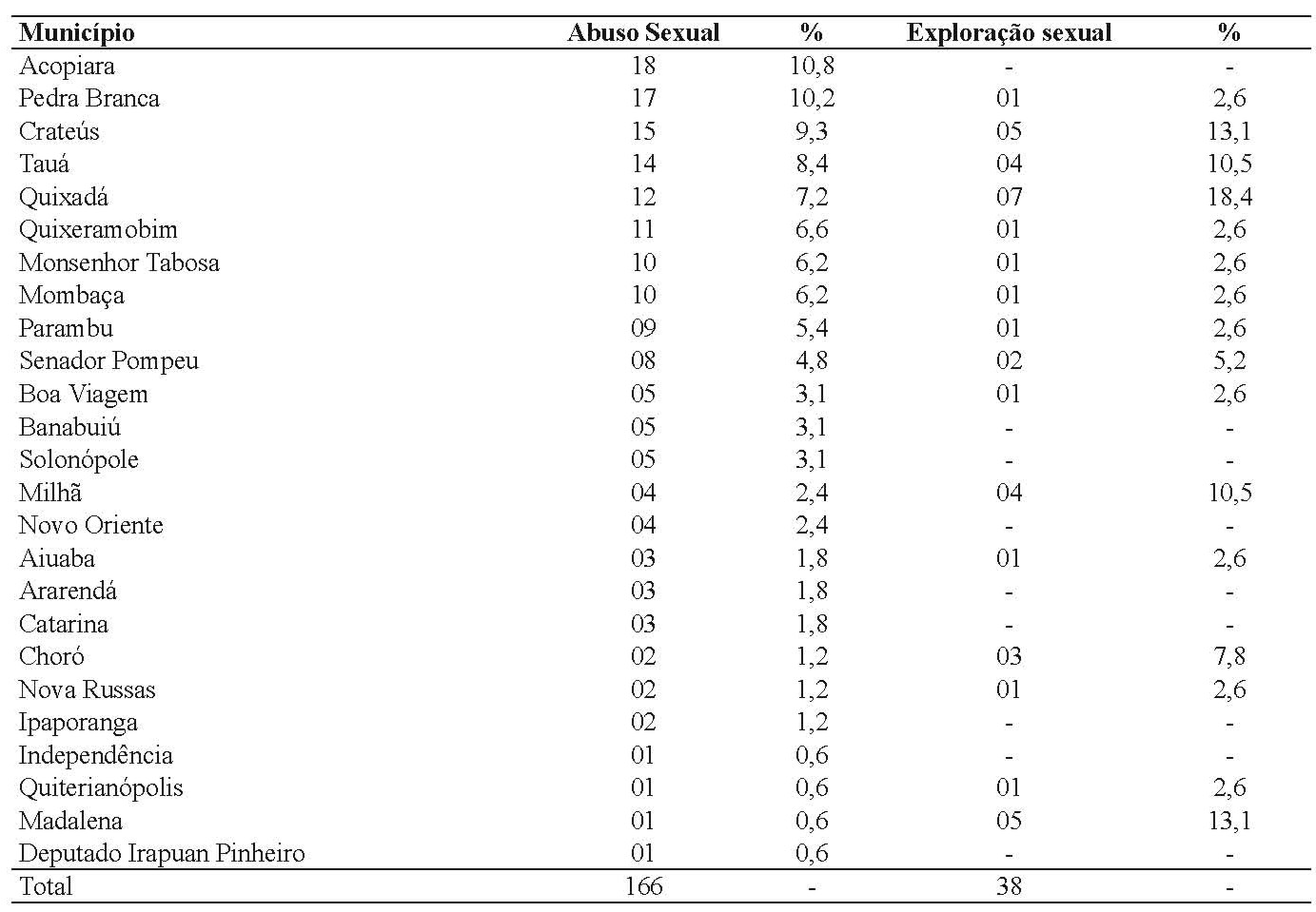 Analisaram-se os 210 municípios do sertão cearense, dentre eles os municípios que receberam destaque para casos de denúncias por abuso sexual contra crianças e adolescentes foram Acopiara com 18 (10,8%), Pedra Branca com 17 (10,2%) e Crateús com 15 (9,3%). Já para os casos de exploração sexual, destaca-se Quixadá e Crateús com 07 (18,4%) e 05 (13,1%) respectivamente (Tabela I).