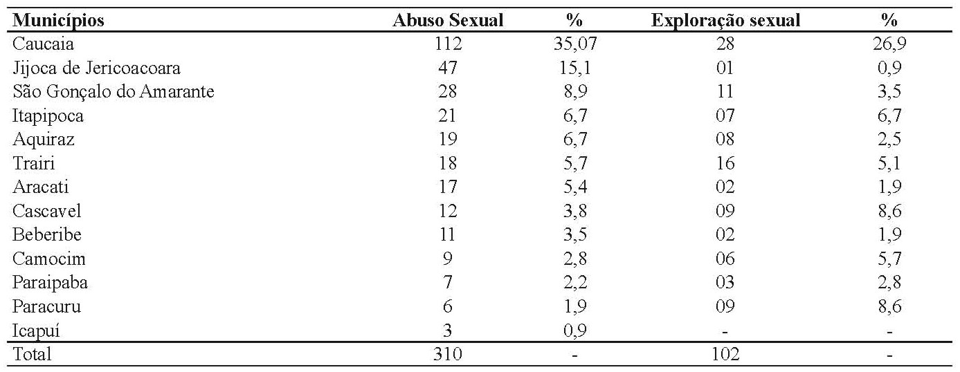 Conforme a Tabela II, o município de Caucaia representa o município com maior número de denúncias, com 112 casos de abuso sexual, seguido de Jijoca de Jericoacoara com 47 (15,1%) e São Gonçalo do Amarante com 28 (8,9%). Em seguida, com casos de exploração sexual no ranking, estão os municípios de Caucaia, com 28 (26,9%) casos de denúncias, seguido de Trairi 16 (5,1%) e São Gonçalo do Amarante com 11 (3,5%).