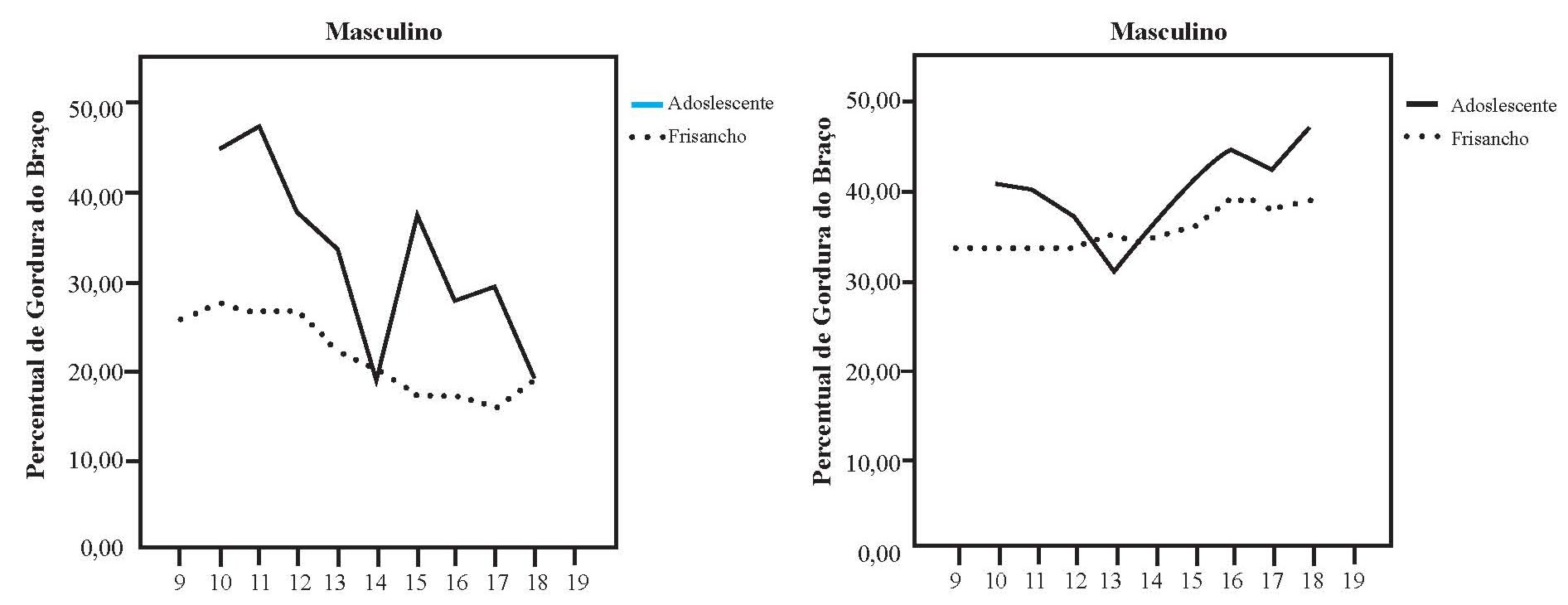 Os valores de percentual de gordura do braço dos atletas foram comparados com o percentil 50 da referência de Frisancho(15) (Figura 3). Percebe-se que os adolescentes do estudo apresentaram valores acima da referência.
