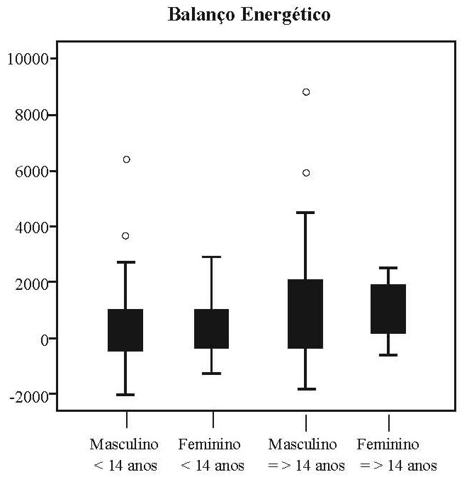 Um balanço energético positivo foi encontrado na maioria dos adolescentes avaliados e esse dado se correlacionou negativamente com a composição corporal apenas nos meninos. No entanto, no sexo feminino, não foi observada correlação entre essas variáveis.