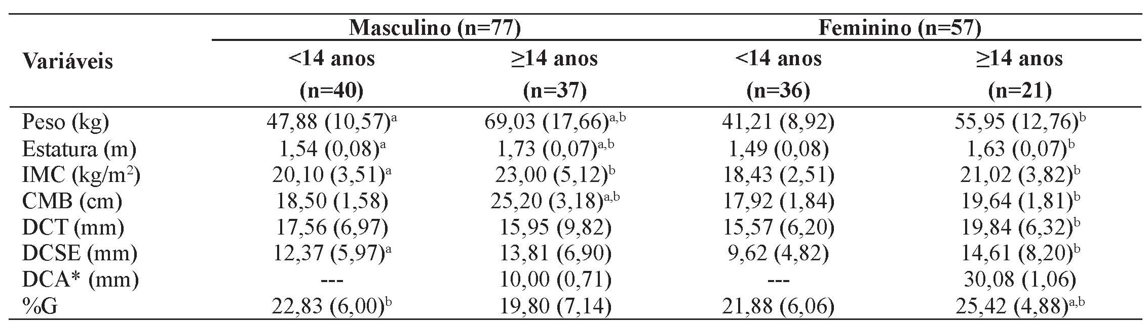 Ao comparar os sexos na mesma faixa etária, percebe-se que os adolescentes do sexo masculino possuem maior massa corporal (p=0,008, entre menores de 14 anos e p=0,002, entre os indivíduos com idade igual ou superior a 14 anos) e maior estatura (p=0,016 para menores de 14 anos e p<0,001, para indivíduos com idade igual ou superior a 14 anos) em relação às adolescentes do sexo feminino. Quanto a CMB e %G, os indivíduos menores de 14 anos não diferiram entre si, apenas os com idade maior ou igual a 14 anos. Entre o grupo com faixa etária maior ou igual a 14 anos, o sexo masculino apresentou maior conteúdo de massa muscular e o sexo feminino, maiores percentuais de gordura corporal.