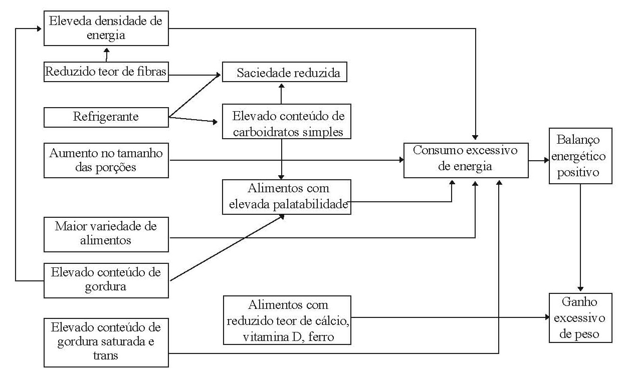 A relação entre densidade energética (razão entre a quantidade de energia e o peso do alimento pronto para o consumo) e o ganho de peso pode ser explicada pela capacidade limitada que os indivíduos têm para distinguir alimentos com conteúdo altamente energético e ajustar adequadamente a ingestão alimentar para manter a homeostase energética. Normalmente, tende-se a manter constante o volume dos alimentos consumidos, independente da variação na densidade de energia. Assim, o consumo de alimentos de alta densidade energética pode favorecer o aumento da ingestão passiva de energia e contribuir para o ganho de peso(6).