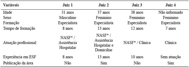 Após a definição do protocolo, iniciou-se a segunda etapa do estudo, ou seja, a análise dos juízes. A Tabela I apresenta a caracterização desses profissionais.