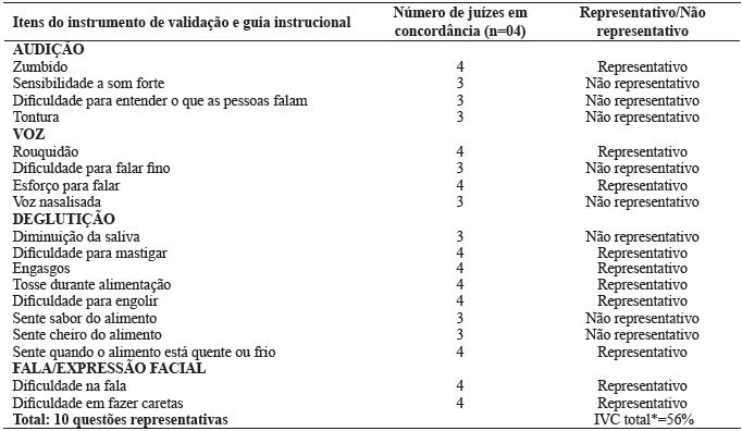 A primeira etapa desse estudo resultou na modificação do instrumento de triagem, reduzindo os itens inicialmente propostos. Os juízes realizaram nova análise, revalidando o instrumento, que resultou na concordância e permanência dos dez itens considerados anteriormente como representativos. O IVC total de 100% pode ser identificado na Tabela III.