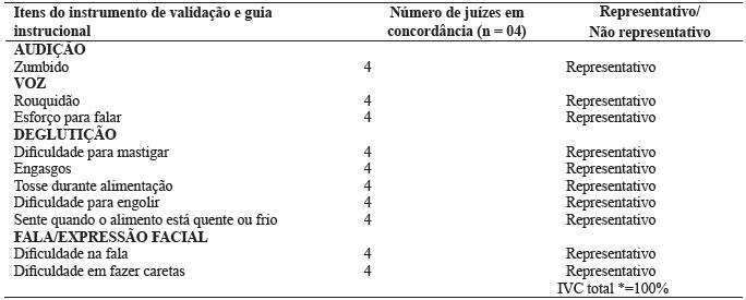 A leitura e discussão do material descrito no Quadro I resultaram na construção de um instrumento de 18 itens, abrangendo quatro seções: audiologia (quatro itens); voz (quatro itens); deglutição (oito itens); e fala/motricidade orofacial (dois itens), que estão detalhados na Figura 2.