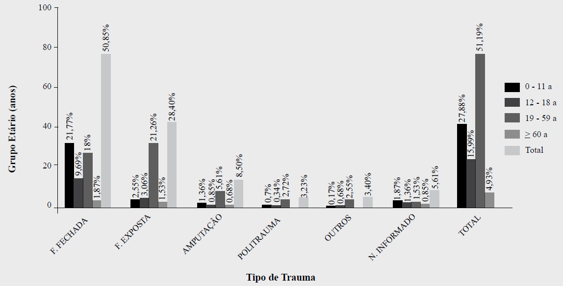 Ao ser comparado o tipo de trauma por grupo etário, observou-se na atual pesquisa que a fratura fechada foi mais comum no grupo de 0 a 11 anos. A fratura exposta afetou mais o grupo de 19 a 59 anos, bem como os demais tipos de trauma. Ao se investigar as características clínicas e demográficas de acidentes com crianças, a causa de trauma mais comum nesse grupo é a queda, que, em geral, ocorre em um ambiente doméstico e acomete os membros com lesões de menor complexidade quando comparada a outros tipos de acidentes(13).