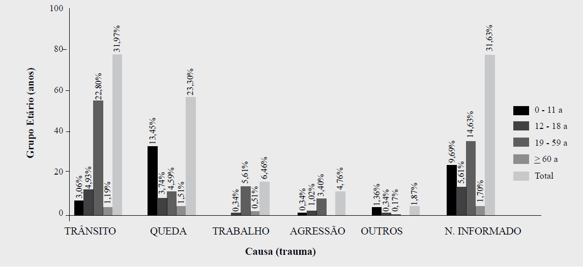 Quanto à causa do trauma por grupo etário, identificou-se no atual estudo maior frequência de acidentes de trânsito no grupo de 19 a 59 anos, e a segunda maior causa dos traumas avaliados é a queda, com 23,30% (137) dos casos, cujo grupo etário mais atingido é o de 0 a 11 anos, com 13,45% (79).