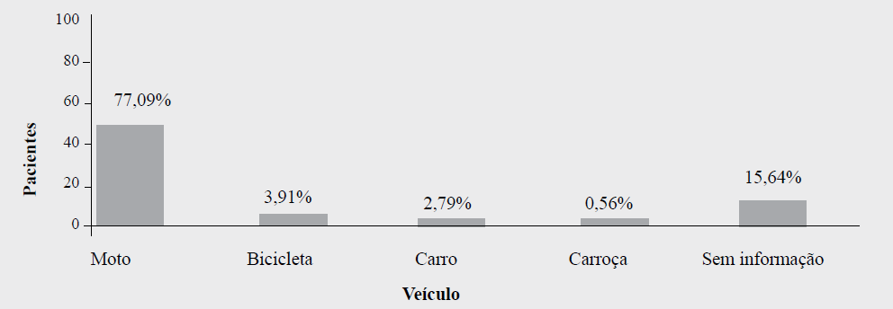 Entre as diversas modalidades de acidentes de trânsito, o mais comumente apresentado é o motociclístico. No atual estudo, observou-se que 77,09% dos acidentes de trânsito tiveram a moto como principal veículo envolvido, o que equivale a 23,47% do total de acidentes da amostra. Outros estudos destacam a moto como o principal veículo envolvido nesse tipo de acidente(3,7,8,24). Os resultados do presente estudo não diferem dos encontrados em estudo realizado num hospital público na Bahia, que traz os acidentes de trânsito como causa principal de trauma, com destaque para os acidentes com motocicletas(3). Esses resultados também foram identificados em outro estudo, que caracterizou os acidentes de trânsito e a gravidade dos traumas em um hospital de urgência em Natal, Rio Grande do Norte(25).
