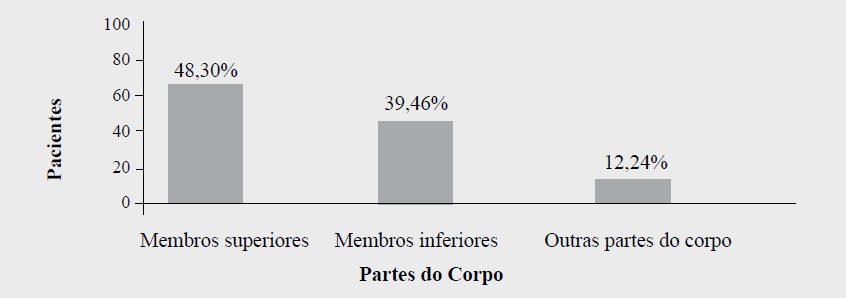 A respeito das principais partes do corpo afetadas, constatou-se uma maior incidência de lesões nos membros superiores na presente pesquisa, totalizando 48,30% dos casos; seguido de membros inferiores, com 39,46%; e outras partes do corpo, com 12,24% (72). Resultados semelhantes foram encontrados em um estudo sobre o atendimento fisioterapêutico em um ambulatório de ortopedia e traumatologia em Avaré, São Paulo(26). Entretanto, distribuições diferentes têm sido identificadas, como uma maior incidência nos membros inferiores, especialmente em vítimas de acidentes motociclísticos(3,9,11).