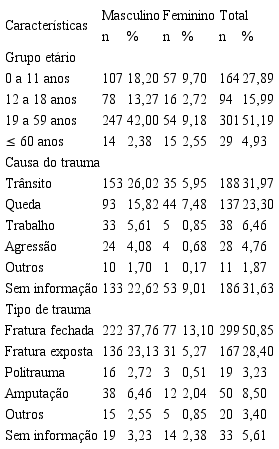 A Tabela I expressa dados referentes às características dos pacientes internados quanto ao grupo etário, causa e tipo de trauma, agrupando os indivíduos por sexo. Verifica-se que o sexo masculino é predominante em todos os grupos, excetuando-se no grupo dos 60 anos ou mais, onde há um predomínio discreto do sexo feminino com 2,55% (n=15) em relação ao sexo masculino, com 2,38% (n=14). Também é possível notar que o grupo etário de maior frequência de internação é o de 19 a 59 anos, com 51,19% (n=301) das internações, seguido do grupo de 0 a 11 anos.