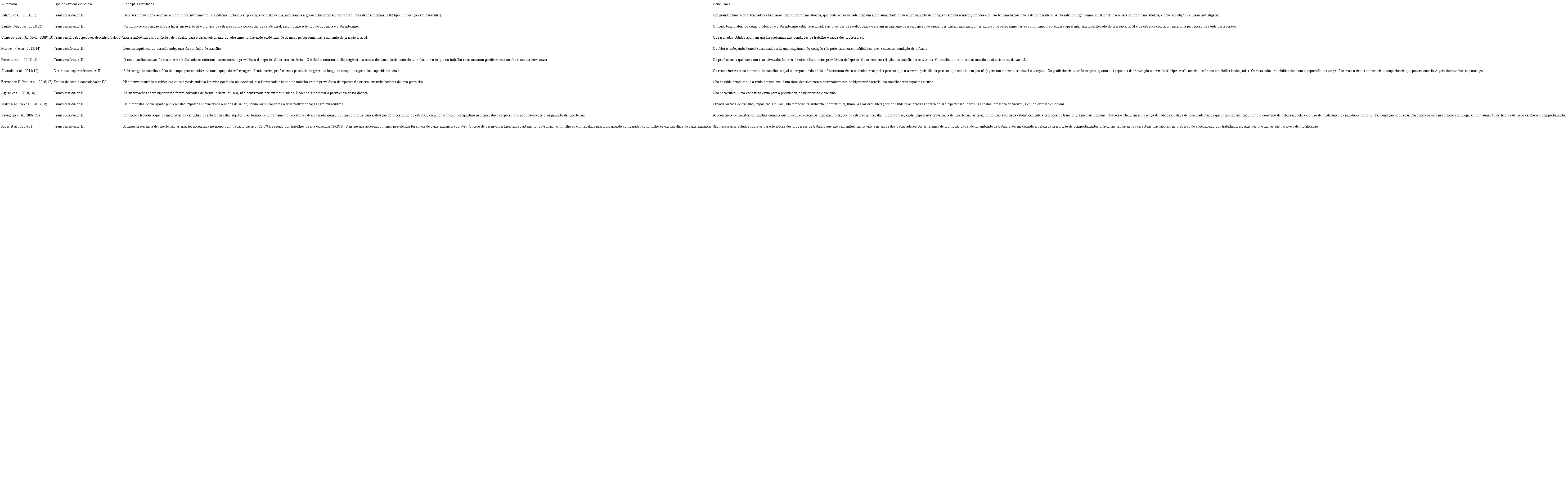 O objetivo deste estudo foi identificar evidências na literatura da interrelação entre trabalho/ocupação e o aparecimento da hipertensão arterial sistêmica.