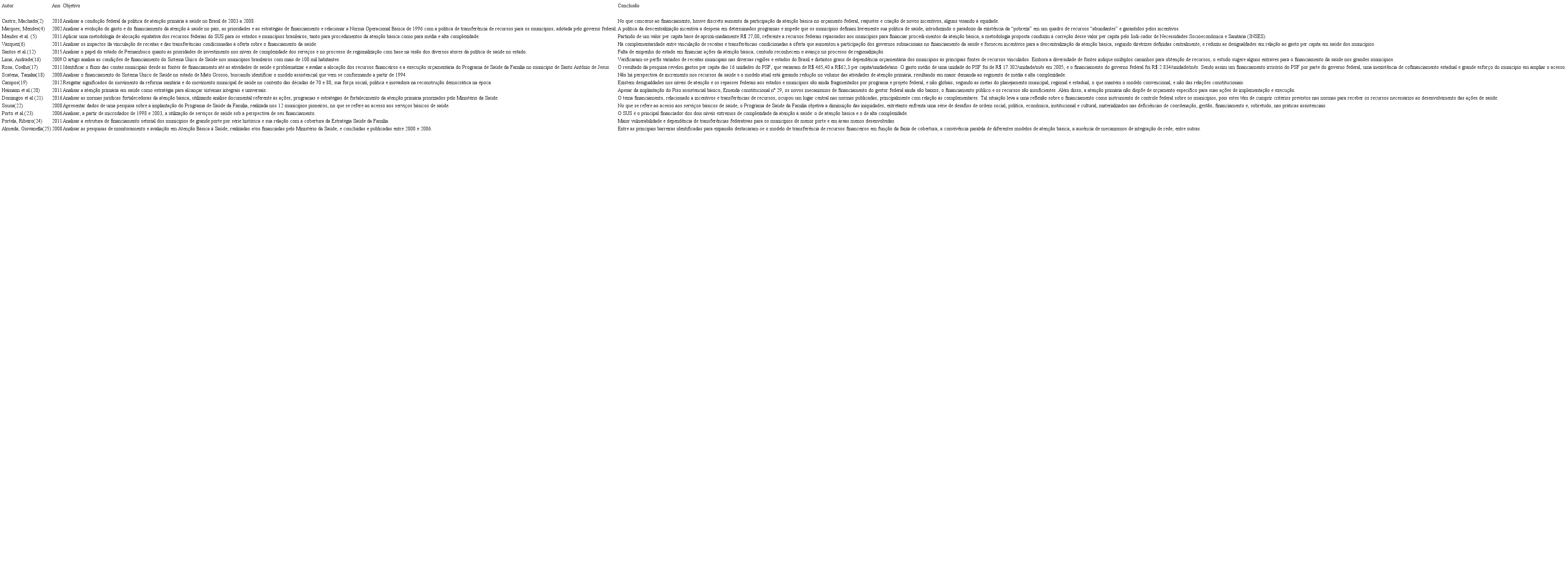 Os principais resultados dos estudos encontrados foram apresentados em um quadro para melhor visualização das evidências (Quadro I). Quanto aos objetivos propostos pelas publicações, foram identificados trabalhos que avaliaram o financiamento APS, as leis que regulamentam a atenção primária, o impacto do financiamento ao longo do tempo e a participação dos entes federativos no financiamento.