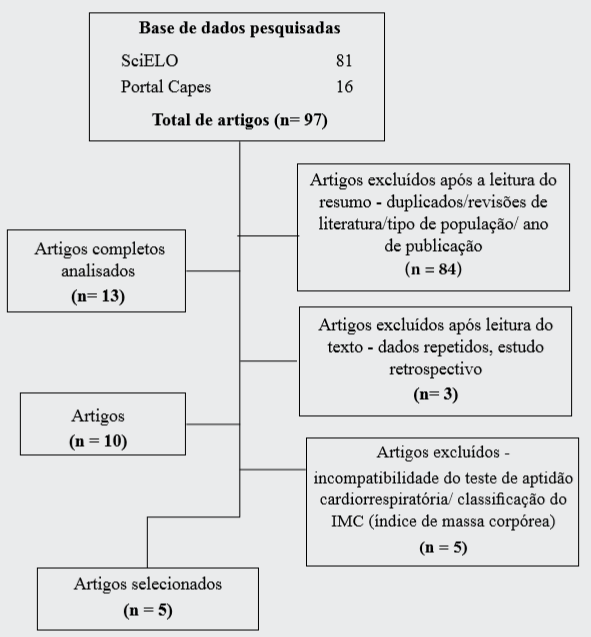 Foram identificados 97 estudos e desses, 84 foram excluídos após a aplicação da primeira etapa dos critérios de inclusão, resultando em 13 artigos que foram analisados na íntegra. Destes, três foram excluídos por conterem dados repetidos e estudo retrospectivo, e outros cinco foram excluídos por apresentarem incompatibilidade do teste de aptidão cardiorrespiratória e da classificação do IMC, resultando em cinco artigos para análise de revisão. A figura 1 apresenta o fluxograma da estratégia utilizada para a seleção dos artigos e demonstra o total de artigos excluídos.