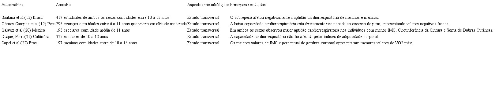 Os artigos incluídos no estudo são apresentados no Quadro I, sendo possível observar informações sobre os autores, ano de publicação, país onde a pesquisa foi realizada, amostra, aspectos metodológicos, principais resultados sobre as variáveis cardiorrespiratórias e o excesso de peso. Os resultados mostram que a baixa capacidade cardiorrespiratória está relacionada com sobrepeso/obesidade, sendo que escolares com IMC elevado apresentaram valores menores quando comparados com seus pares eutróficos.