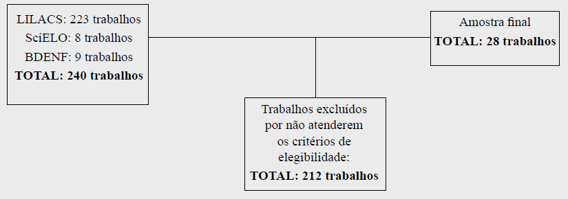 A amostra inicial contou com 240 artigos, sendo 223 encontrados na base de dados LILACS, oito na SciELO e nove na BDENF. Após serem aplicados os critérios de elegibilidade e exclusão, resultaram 28 artigos (figura 1). Para tanto, visando a sistematização dos dados, utilizou-se um instrumento de fichamento elaborado pelos autores, onde constou: título, ano, autores, objetivos e resultados.
