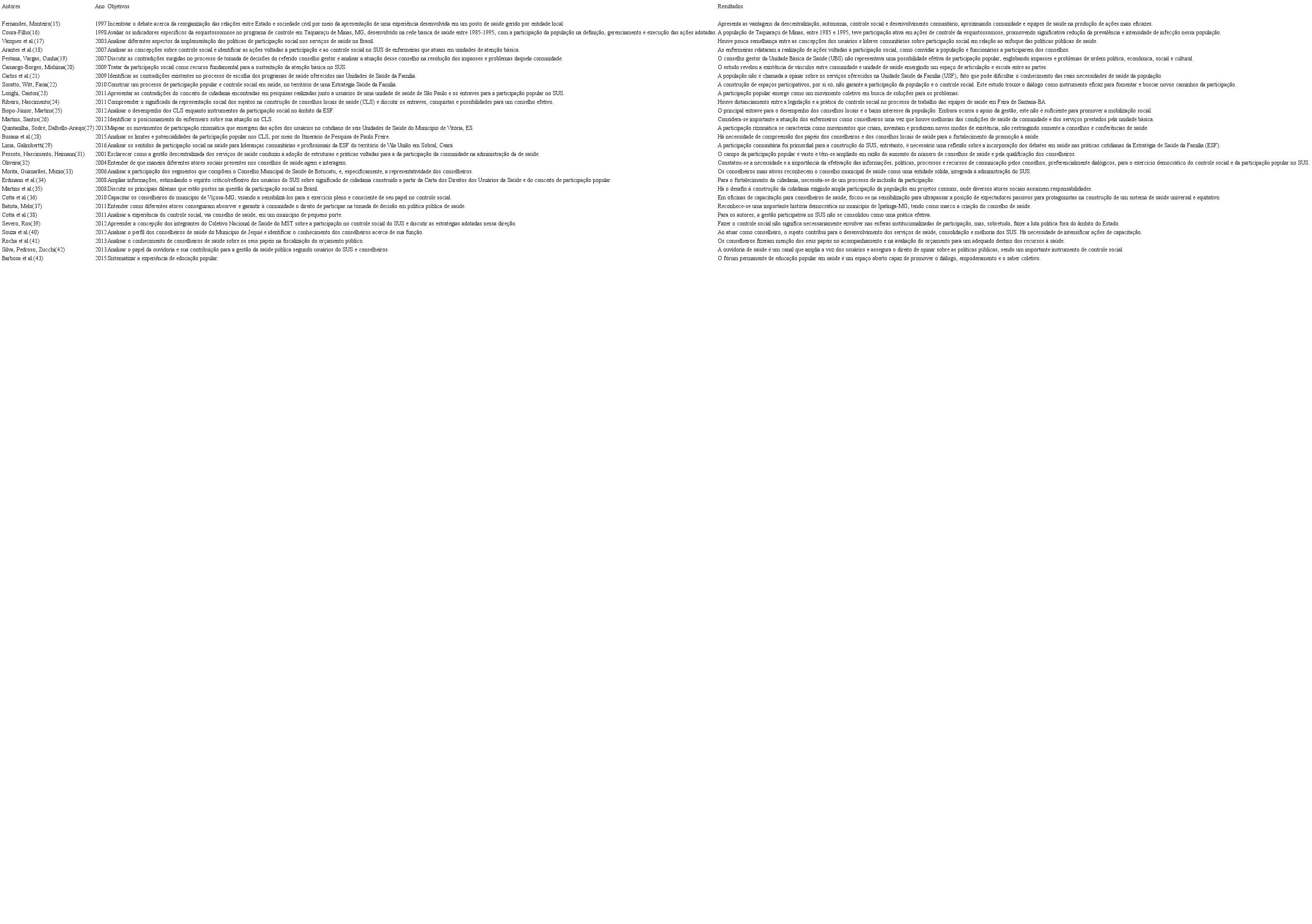 O quadro abaixo apresenta uma síntese dos 28 artigos(15,16,17,18,19,20,21,22,23,24,25,26,27,28,29,31,32,33,34,35,36,37,38,39,40,41,42,43) sobre participação comunitária que compuseram a amostra (Quadro I).