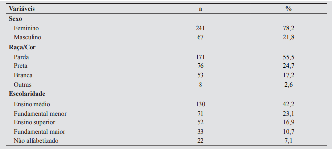 Os dados sociodemográficos estão dispostos na Tabela I, em que se observa a prevalência do sexo feminino em 78,2% (n=241), da raça/cor parda em 55,5% (n=171) e do nível de escolaridade ensino médio completo em 42,2% (n=130).