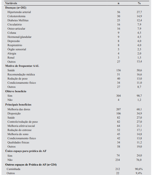 Além disso, constatou-se que 76% (n=234) dos usuários investigados na atual pesquisa complementam sua atividade em outros espaços, sendo a caminhada (90,6%, n=212) a mais praticada. Outras pesquisas(18,20) trazem resultados semelhantes, portanto, os dados demonstram grande importância na complementação da atividade na AAL e são necessários para considerar a conquista dos benefícios.