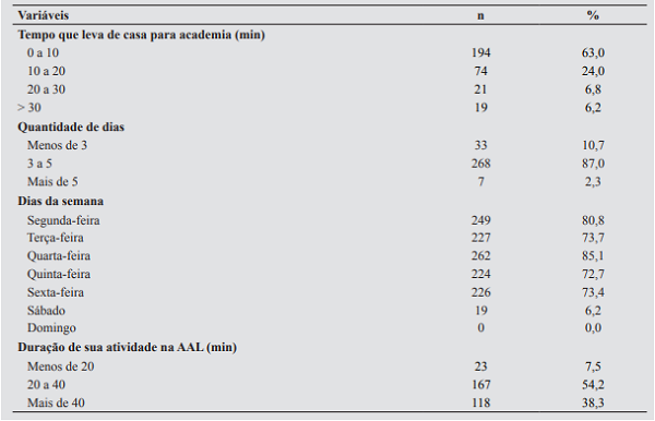 Averiguou-se que 63% (n=194) dos usuários levam até 10 minutos no percurso de sua casa até a academia, que 87% (n=268) frequentam entre três e cinco vezes por semana, sendo os dias mais frequentados quarta-feira (85,1%, n=262), segunda-feira (80,8%, n=249) e terça-feira (73,7%, n=227), respectivamente. A maior faixa de frequência de permanência em exercício na AAL está entre 20 a 40 minutos (54,2%, n=167).