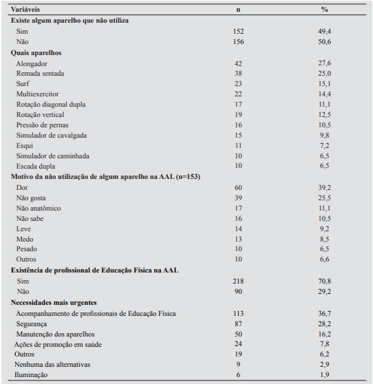 Verificando a existência de aparelhos não utilizados e as justificativas para sua não utilização, reforça-se a importância da presença dos profissionais de Educação Física e da manutenção dos aparelhos, pois, quando impossibilitados da orientação de profissional e da falta de manutenção, deixa-se de ser um espaço voltado para a melhoria da saúde, embora em 70,8% (n=218) delas houvesse a presença do referido profissional, 36,7% (n=113) consideraram a necessidade do acompanhamento permanente desse profissional como uma das necessidades mais urgentes na pesquisa em questão. Esse dado corrobora outros achados(7), em que se observou que praticantes de exercícios físicos em centros esportivos possuíram melhor percepção da qualidade de vida se comparados aos praticantes de exercícios físicos em AAL de Maringá (Paraná), supostamente demonstrando a importância da atividade estruturada e da orientação de um profissional de Educação Física para melhorar a qualidade de vida das pessoas nesses locais.