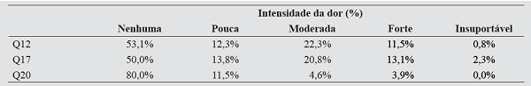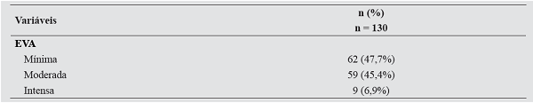 Os escores médios da escala visual analógica (EVA) encontrados são de 2, 99, com desvio padrão de ± 2,79, em que o valor mínimo encontrado é 0 e o máximo é 10 na escala. Dividindo a EVA em faixas de intensidade, pode-se constatar na Tabela I que a maioria das participantes apresenta dor de intensidade mínima, seguida pela moderada e a intensa.
