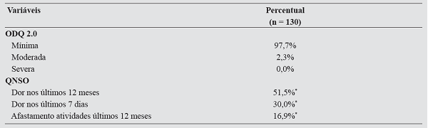 Os resultados apresentados pelo ODQ indicam que: 97,7% (n=127) das participantes apresentaram grau de incapacidade funcional mínimo; 2,3% (n=3) das participantes apresentam grau de incapacidade funcional moderado. Nenhuma das participantes apresenta grau de incapacidade funcional severo no momento (Tabela III). Ao se comparar o ODQ ao QNSO, identificou-se que, nos últimos 12 meses, 51,5% (n=67) das mulheres apresentaram algum tipo de dor na região lombar e 16,9% (n=22) delas se afastaram de seus afazeres por conta da dor.