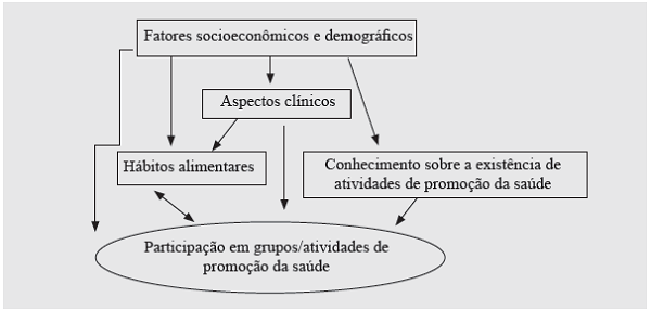 A Figura 1 retrata o modelo teórico do presente estudo partindo de pressupostos da literatura quanto aos possíveis determinantes e seu nível de relação com o desfecho. No nível mais distal, encontram-se as variáveis socioeconômicas e demográficas, uma vez que influenciam todas as demais. No nível medial, estão os aspectos clínicos. No nível mais proximal, o conhecimento sobre existência das atividades de promoção da saúde e os hábitos alimentares (Figura 1).