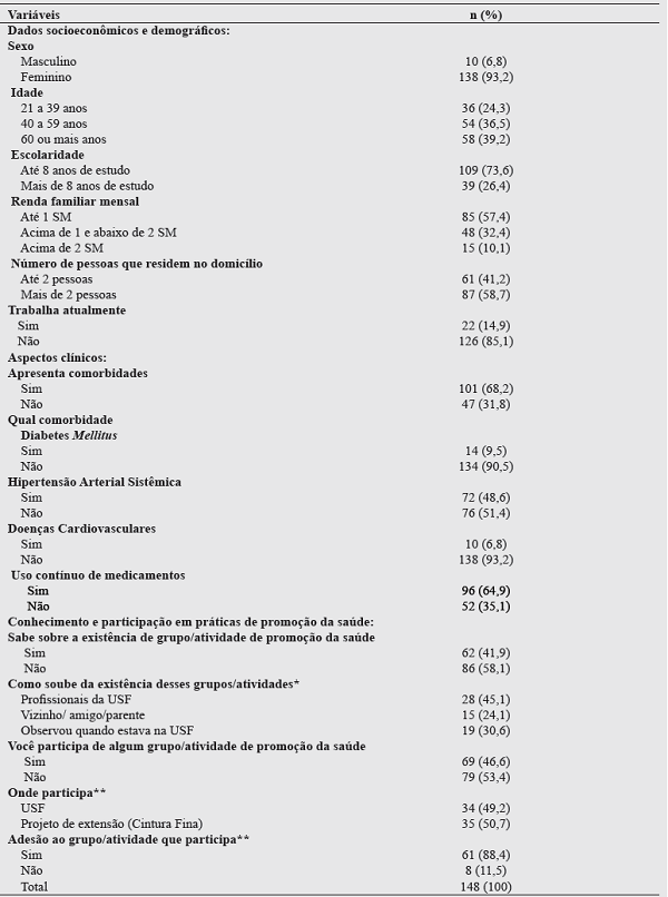 Dos 148 participantes avaliados, 113 (76,4%) foram entrevistados em uma USF e 35 (23,6%) no projeto de extensão Cintura Fina. Foi encontrada a média de 52,9 anos, tendo como idade mínima 21 e máxima de 86 anos. Verificou-se entre todos os entrevistados maior prevalência do sexo feminino (93,2%; n=138), idade acima de 60 anos (39,2%; n=58), até 8 anos de estudo (73,6%; n=109), renda familiar de até 1 salário mínimo (57,4%; n=85) e pessoas que não trabalhavam (85,1%; n=126) (Tabela I).